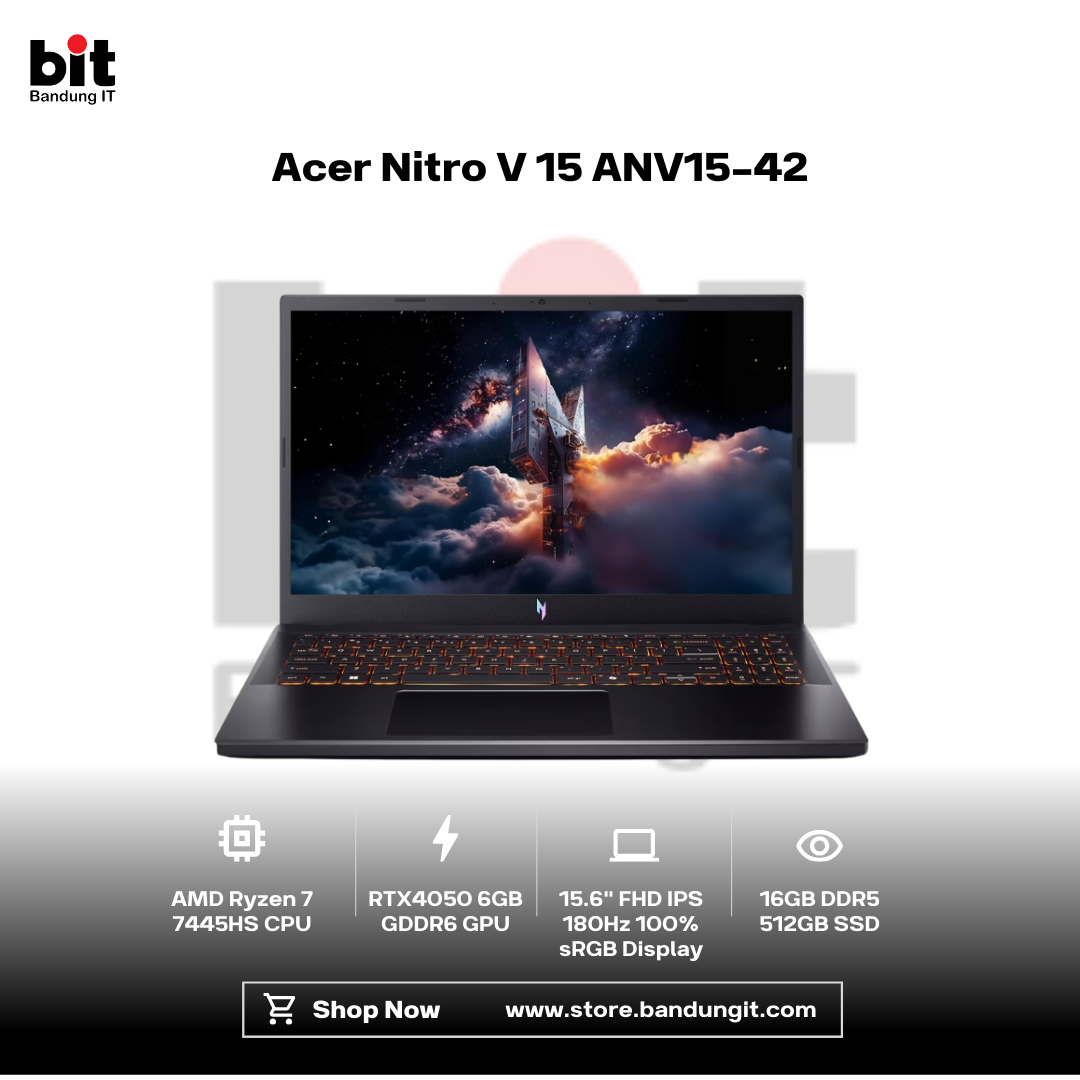 Acer Nitro V 15 ANV15-42 adalah laptop gaming bertenaga yang dirancang untuk performa tinggi dan pengalaman visual maksimal. Mengandalkan AMD Ryzen 7 7445HS berpadu dengan NVIDIA GeForce RTX 4050 6GB, laptop ini sanggup menjalankan game AAA, rendering, hingga multitasking berat dengan stabil dan cepat. Layar 15,6 inci FHD IPS 180Hz dengan 100% sRGB menyajikan visual super mulus, tajam, dan akurat warna—ideal untuk gaming kompetitif maupun konten kreatif. Didukung RAM 16GB DDR5 dan SSD PCIe 4.0, respons sistem terasa gesit di setiap aktivitas. Dengan desain kokoh khas Nitro, konektivitas lengkap termasuk USB4 Type-C, serta bonus Windows 11 dan Office resmi, Acer Nitro V 15 siap jadi partner andalan untuk kerja serius dan gaming tanpa kompromi.
