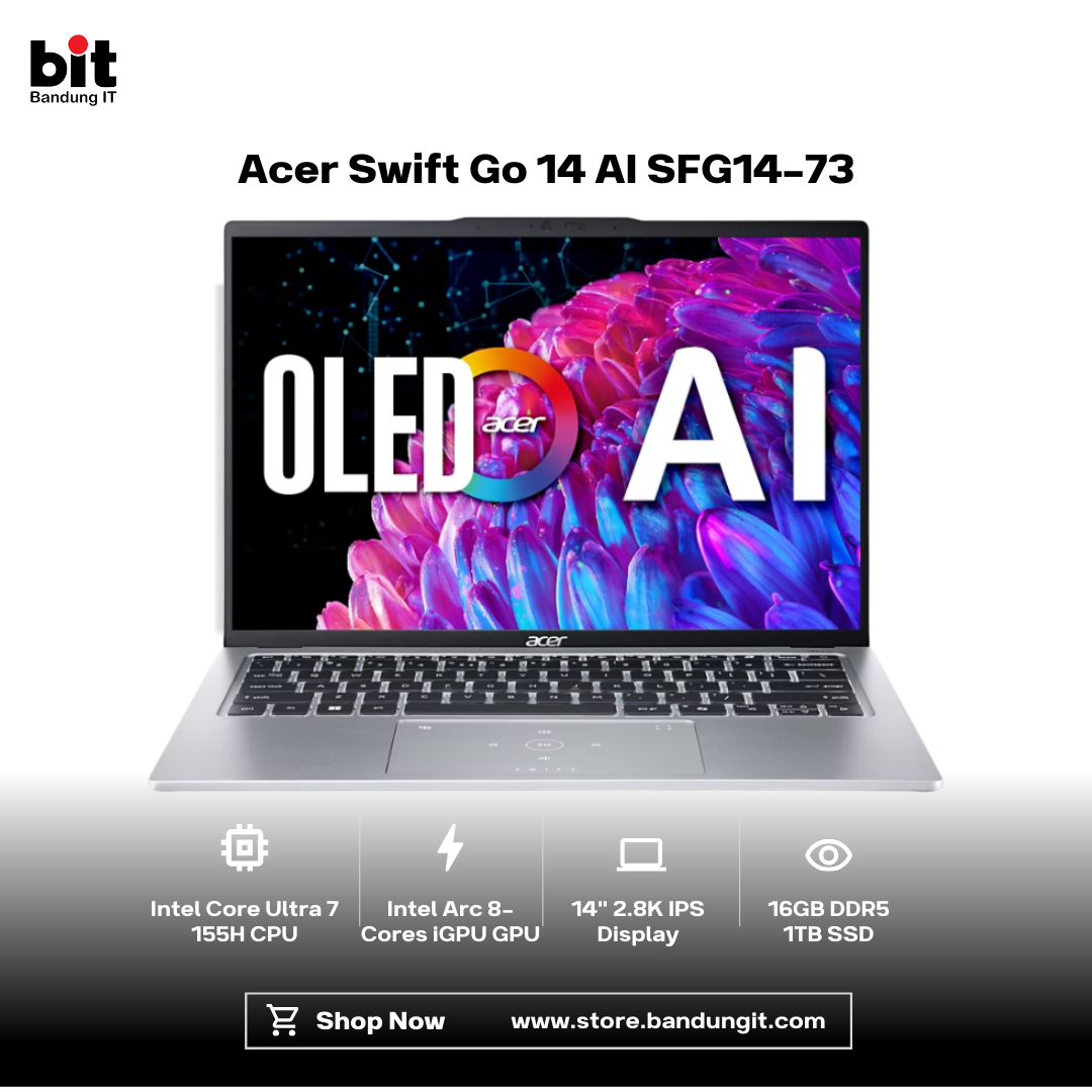 Acer Swift Go 14 AI SFG14-73 dirancang sebagai laptop premium tipis dan ringan yang mengutamakan performa cerdas untuk produktivitas modern. Didukung prosesor Intel Core Ultra 7 155H dengan iGPU Intel Arc 8-Core, perangkat ini mampu menangani multitasking, kerja kreatif, hingga aplikasi berbasis AI dengan responsif dan efisien. Layar 14” 2.8K IPS menghadirkan detail visual tajam dan warna yang nyaman untuk bekerja maupun menikmati hiburan. Dengan bobot hanya 1,25 kg, konektivitas mutakhir melalui Thunderbolt 4, HDMI 2.1, Wi-Fi 7, serta penyimpanan besar 1TB PCIe 4.0, Swift Go 14 AI menjadi pilihan ideal bagi profesional dan pelajar yang membutuhkan laptop portabel, cepat, dan siap mendukung mobilitas tinggi.