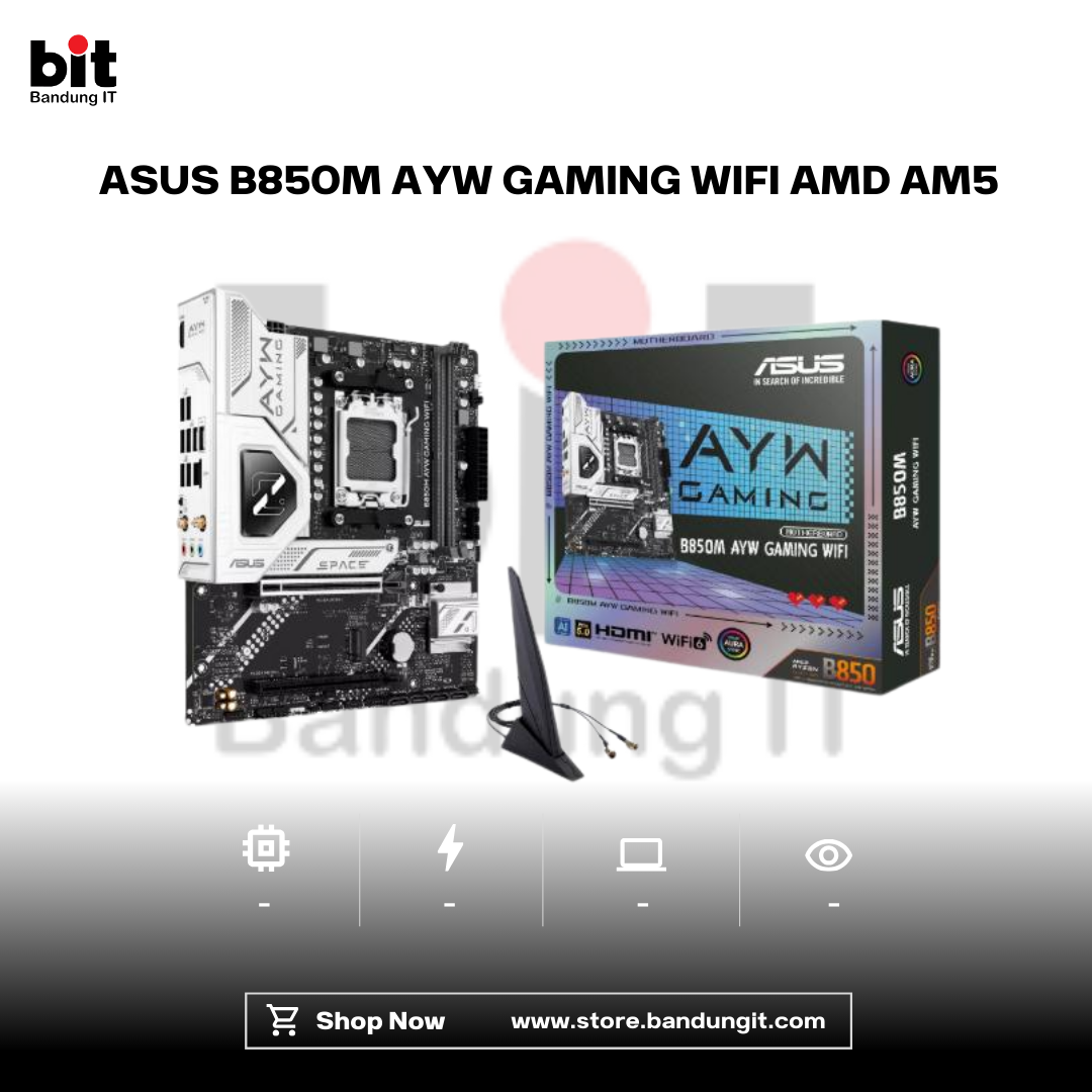 ASUS B850M AYW GAMING WiFi merupakan motherboard micro-ATX ringkas untuk platform AMD Ryzen desktop yang menawarkan performa tinggi dalam ukuran 24.4 cm x 22.1 cm. Mengusung desain PCB enam lapis berwarna hitam dengan heatsink silver-white khas seri AYW, board ini tampil modern sekaligus fungsional untuk sistem gaming maupun produktivitas.