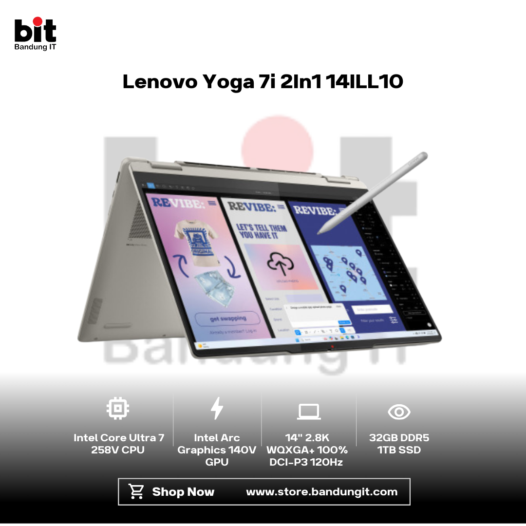 Daya tarik utamanya terletak pada layar 14 inci OLED 2.8K touchscreen 120Hz dengan 100% DCI-P3, menghadirkan warna tajam, kontras dalam, dan gerakan super halus—ideal untuk desain, editing, maupun hiburan premium. Dipadukan dengan RAM 32GB LPDDR5x super cepat, SSD 1TB PCIe 4.0, Wi-Fi 7, serta kelengkapan Lenovo Stylus Pen, laptop ini benar-benar siap “future-ready”. Bobot ringan, sertifikasi Intel Evo, standar MIL-STD-810H, dan garansi resmi 3 tahun + 3 tahun ADP menjadikan Lenovo Yoga 7i pilihan sempurna bagi profesional, kreator, dan eksekutif yang menginginkan satu perangkat untuk semua kebutuhan tanpa kompromi.