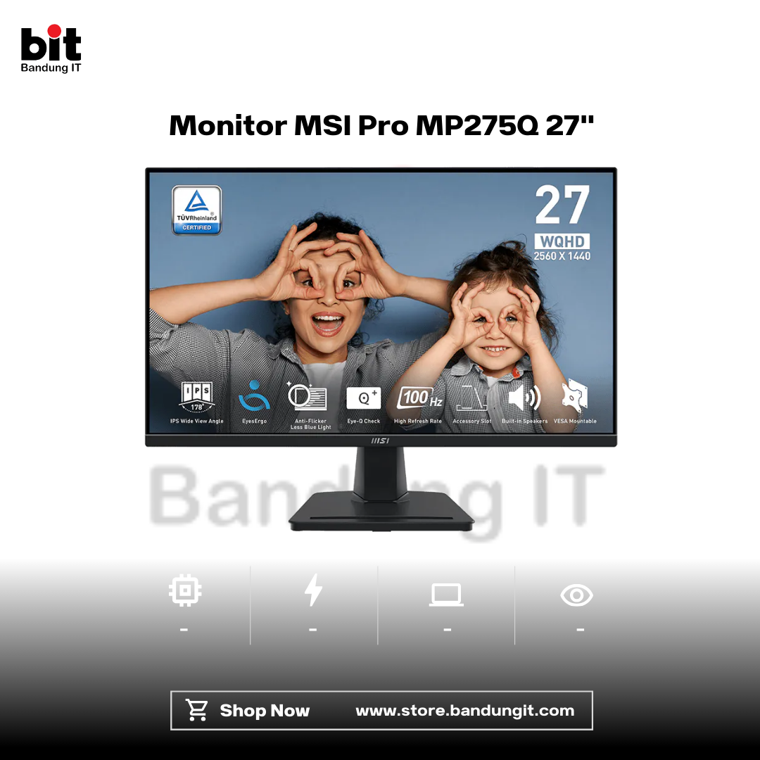 MSI PRO MP275Q adalah monitor produktivitas 27 inci beresolusi WQHD (2560 x 1440) yang menghadirkan area kerja lebih luas dan detail lebih tajam dibanding Full HD. Menggunakan panel IPS flat dengan sudut pandang 178°/178°, monitor ini memberikan warna konsisten dan akurat, didukung 10-bit color (8-bit + FRC) dengan total 1,07 miliar warna. Cakupan warna 100% sRGB dan Rec.709 menjadikannya ideal untuk desain grafis ringan, editing konten, hingga kebutuhan profesional harian.