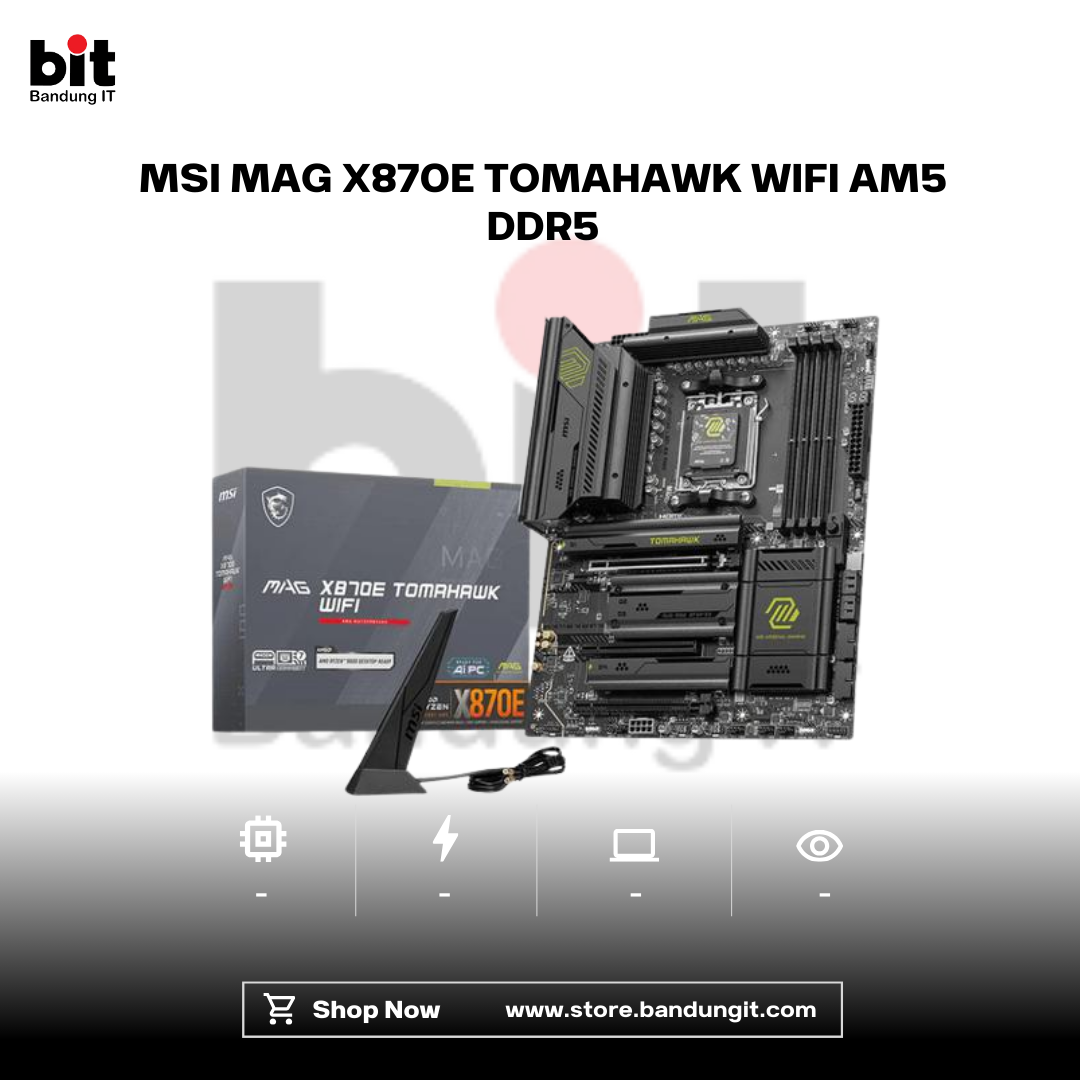 MSI MAG X870E TOMAHAWK WIFI adalah motherboard ATX kelas high-end untuk platform AM5 yang dirancang mendukung prosesor AMD Ryzen terbaru, termasuk seri 9000. Mengusung dukungan DDR5 hingga 256GB (4x UDIMM) dengan kecepatan hingga 8400+ MT/s (OC) serta kompatibel dengan AMD EXPO, CUDIMM, dan overclocking, board ini menawarkan performa memori ekstrem untuk gaming dan produktivitas berat.