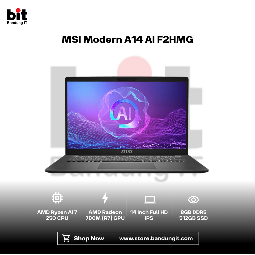 MSI Modern A14 AI adalah laptop modern yang dirancang untuk produktivitas cerdas di era AI. Ditenagai AMD Ryzen AI 5 / Ryzen AI 7 dengan NPU hingga 50 TOPS, laptop ini siap mendukung multitasking cepat, aplikasi berbasis AI, hingga kerja harian yang efisien. Layar 14 inci Full HD IPS memberikan tampilan tajam dan nyaman untuk kerja panjang, sementara bobotnya yang hanya 1,4 kg membuatnya praktis dibawa ke mana saja.
